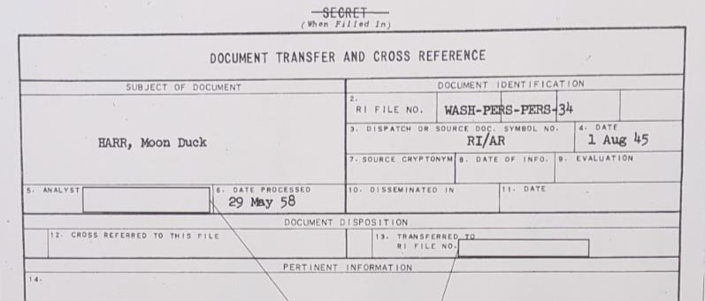 In May 1958, three months after Karl Harr was promoted to a role coordinating covert operations within The White House, a document from Moon Duck Harr’s file, dated August 1, 1945, was transferred to a different records index file, which remains classified today.